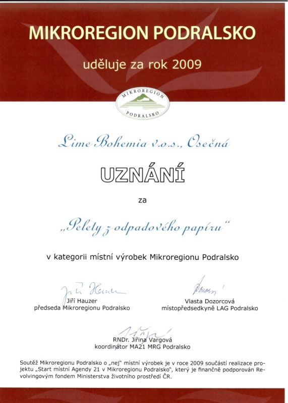Mikroregionu Podralsko získal i připravovaný výrobek pelety z odpadového