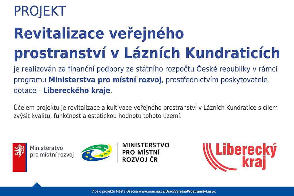 Projekt „Revitalizace veřejného prostranství v Lázních Kundraticích" je realizován za finanční podpory ze státního rozpočtu České republiky v rámci programu Ministerstva pro místní rozvoj, prostřednictvím poskytovatele dotace – Libereckého kraje.
