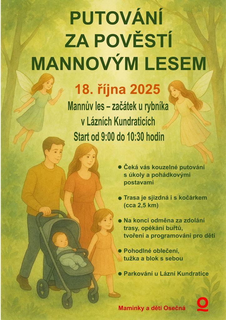18.10.2025 – V sobotu 18. října 2025 se uskutečnila akce „Putování za pověstí Mannovým lesem.“ Startovalo se u rybníka v Lázních Kundraticích a končilo u Bistra Slunce. Zpočátku zachmuřené počasí vystřídalo během dopoledne sluníčko a vylákalo na trasu celkem 60 dětí v doprovodu rodinných příslušníků a jejich domácích mazlíčků.