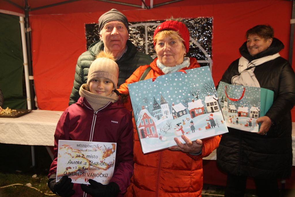 29.11.2025 – Den před první adventní nedělí, v sobotu 29. listopadu 2025, proběhlo na Svatovítském náměstí v Osečné slavnostní rozsvícení vánočního stromu. Akce se těšila velkému zájmu veřejnosti a náměstí zaplnily desítky nadšených návštěvníků. Program zahájilo v 16:00 hodin vystoupení souboru dechových nástrojů Celestýnka společně s dětmi z místní základní školy. Přesně v 16:30 hodin se po společném odpočítávání rozzářil krásně ozdobený vánoční strom a oficiálně tak přivítal adventní čas. O občerstvení se postaral stánek motoristů GRYF Osečná a městský úřad, kde bylo možné zahřát se svařeným vínem či punčem. Nechyběl ani stánek s nealko občerstvením mladých hasičů (Plamínků). Velký zájem vzbudila soutěžní výstava vánoček od místních pekařů-amatérů. Návštěvníci mohli ochutnat všech pět soutěžních vzorků a označit svůj nejoblíbenější. Po celé odpoledne byl k dispozici kočár tažený koňským dvojspřežím pana Jaroslava Diblíčka, který se těšil velkému zájmu malých i velkých návštěvníků. Novinkou letošního roku byl Vánoční fotokoutek – stále plný těch, kteří si chtěli odnést veselou vzpomínku na tento den. U vstupu do kostela opět nechyběl tradiční krásně nasvícený betlém, o jehož přípravu se postarala paní Petra Klížová.