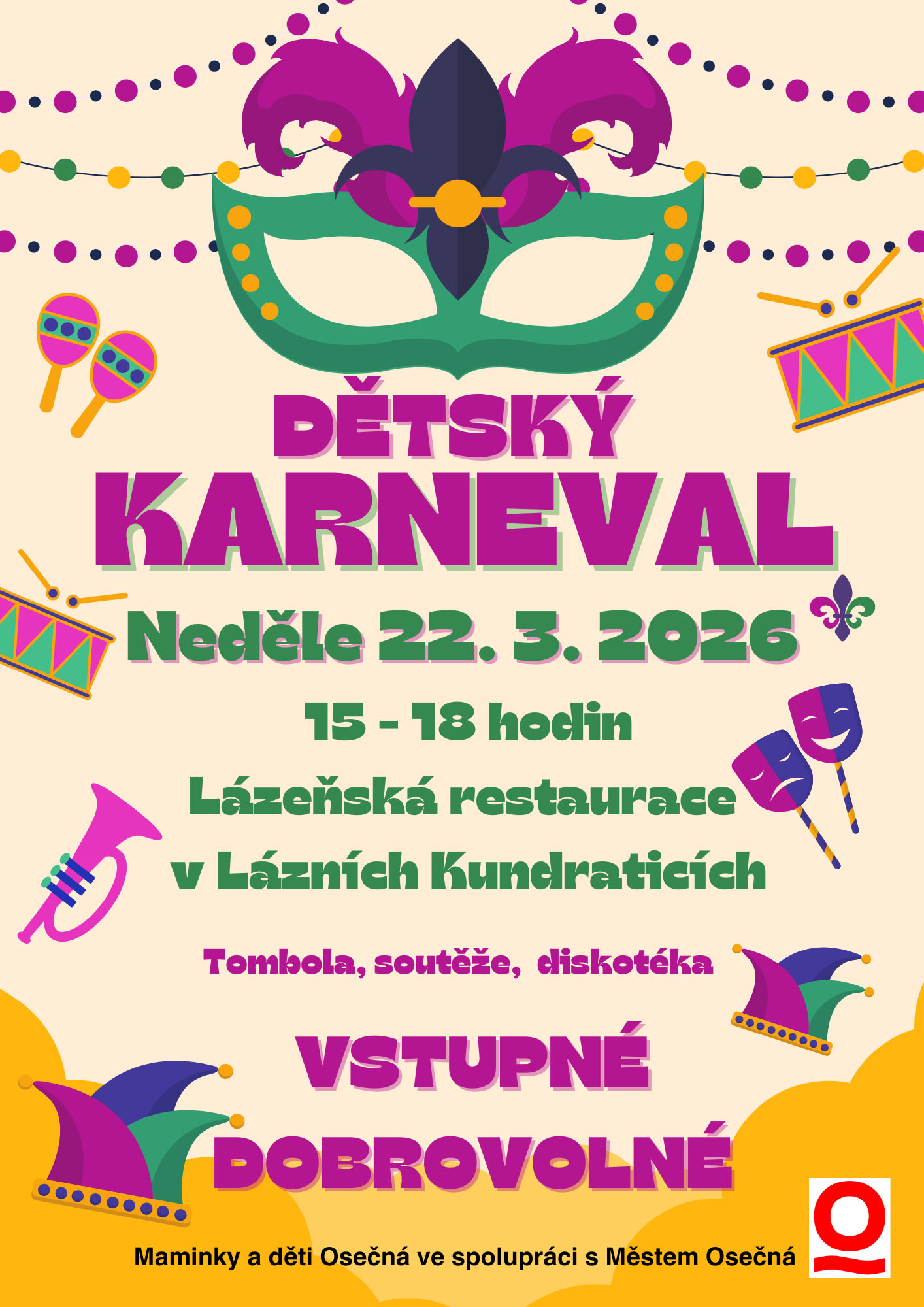 V neděli 22. března 2026 se od 15.00 hodin uskuteční v prostorách Lázeňské restaurace v Lázních Kundraticích Dětský karneval. Pro děti bude připravena diskotéka, několik her, tombola a zábava při tanci. Těšíme se na plno krásných masek. Vstupné je dobrovolné.